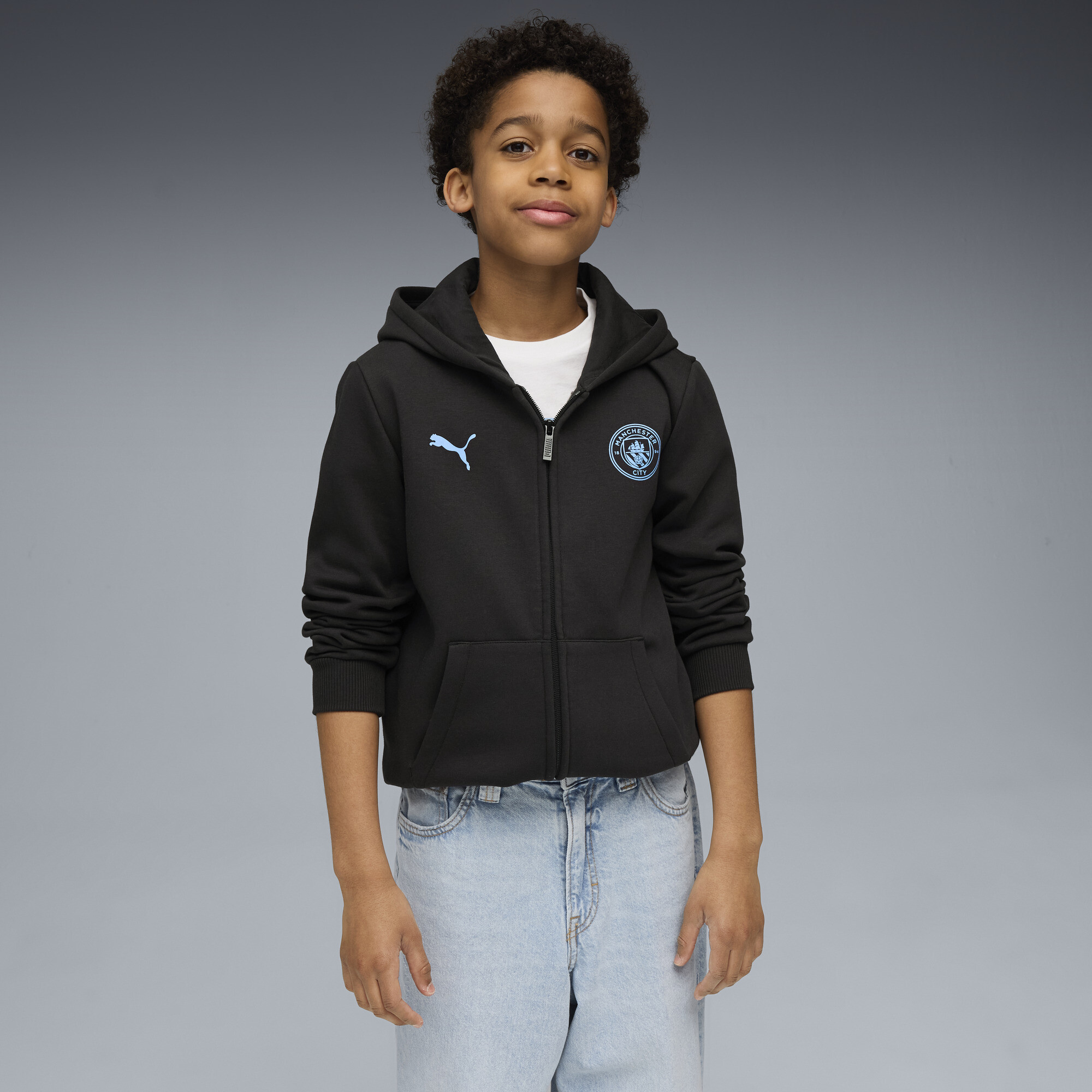 PUMA Manchester City FtblEssentials jack met capuchon, Blauw/Zwart, Maat 11-12Y
