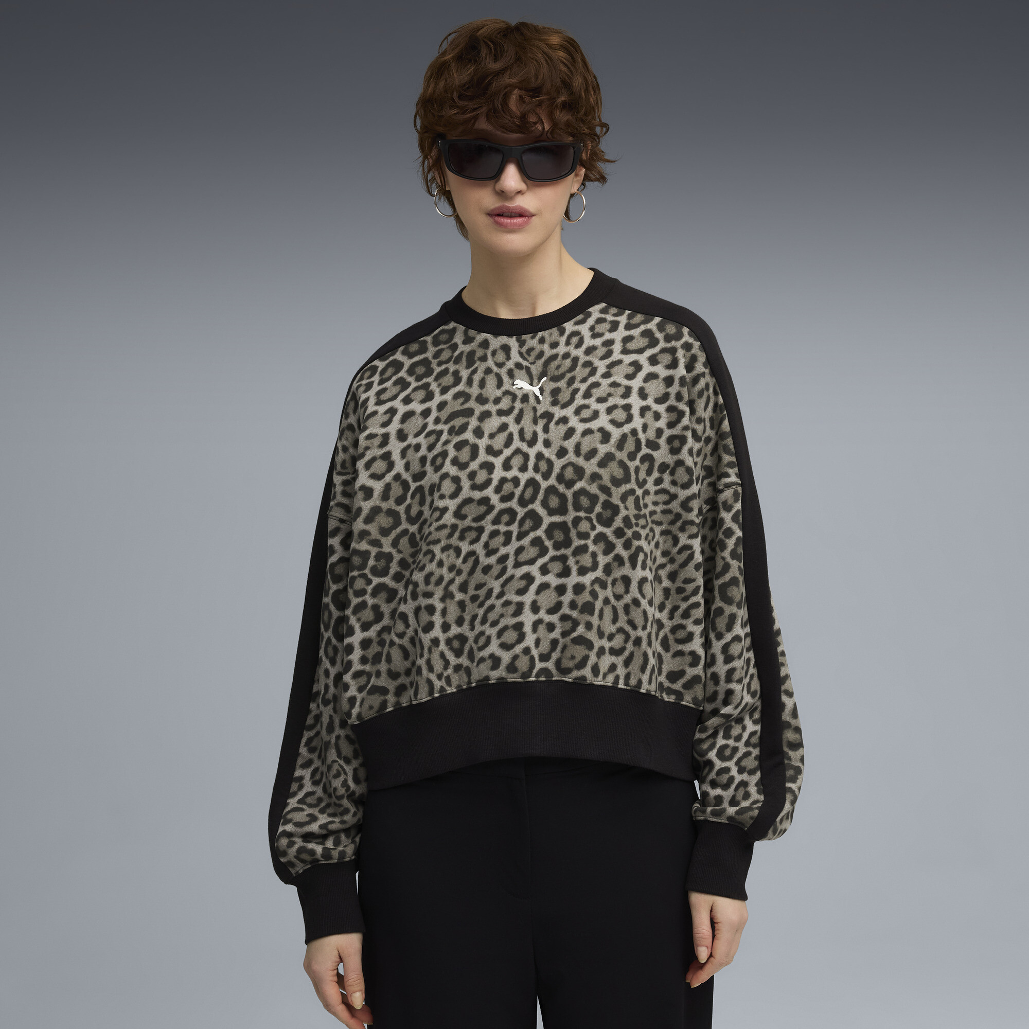PUMA T7 Leo Luxe oversized sweater met ronde hals voor Dames, Zwart, Maat XS