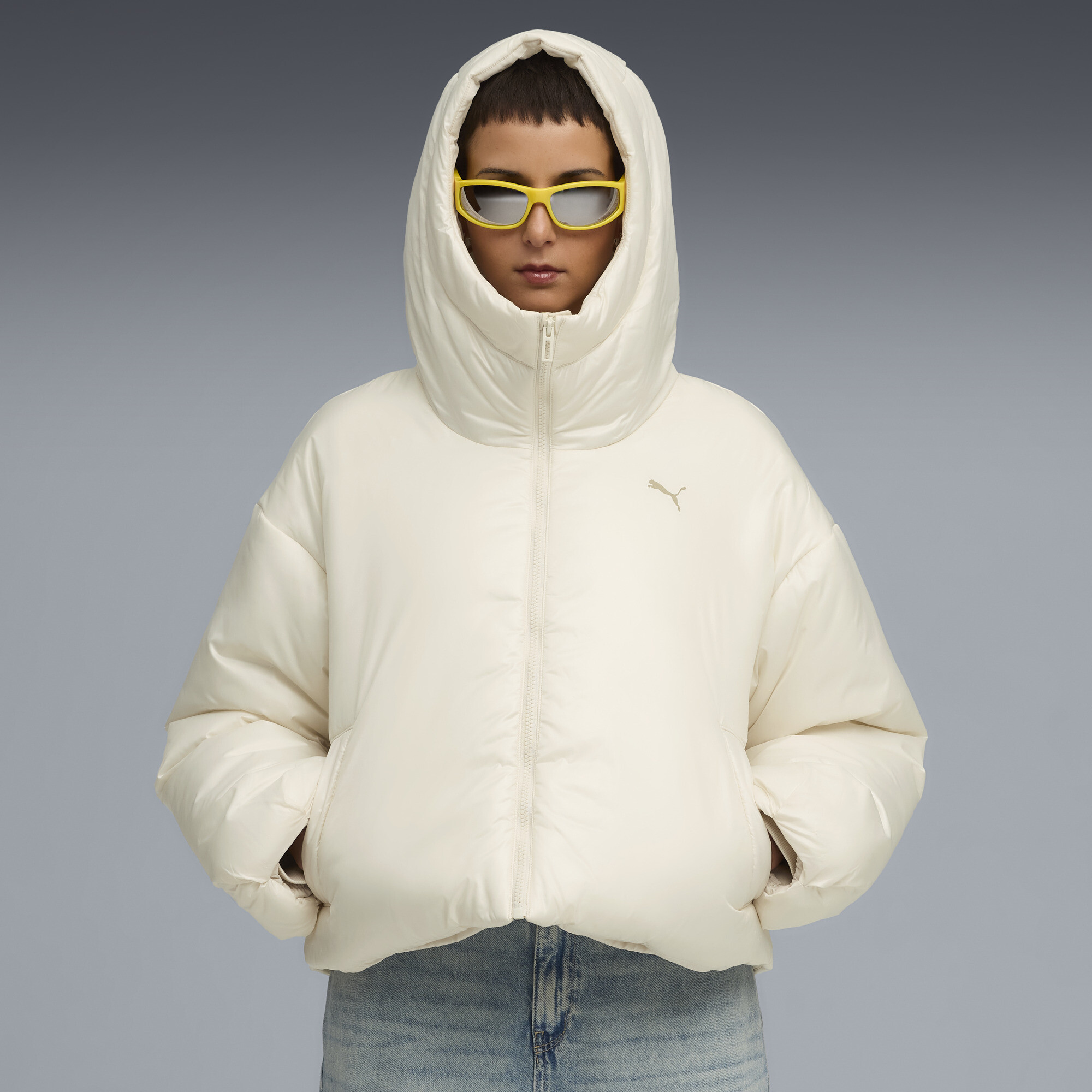 PUMA Wardrobe Essentials glanzende gewatteerde jas met capuchon voor Dames, Maat L