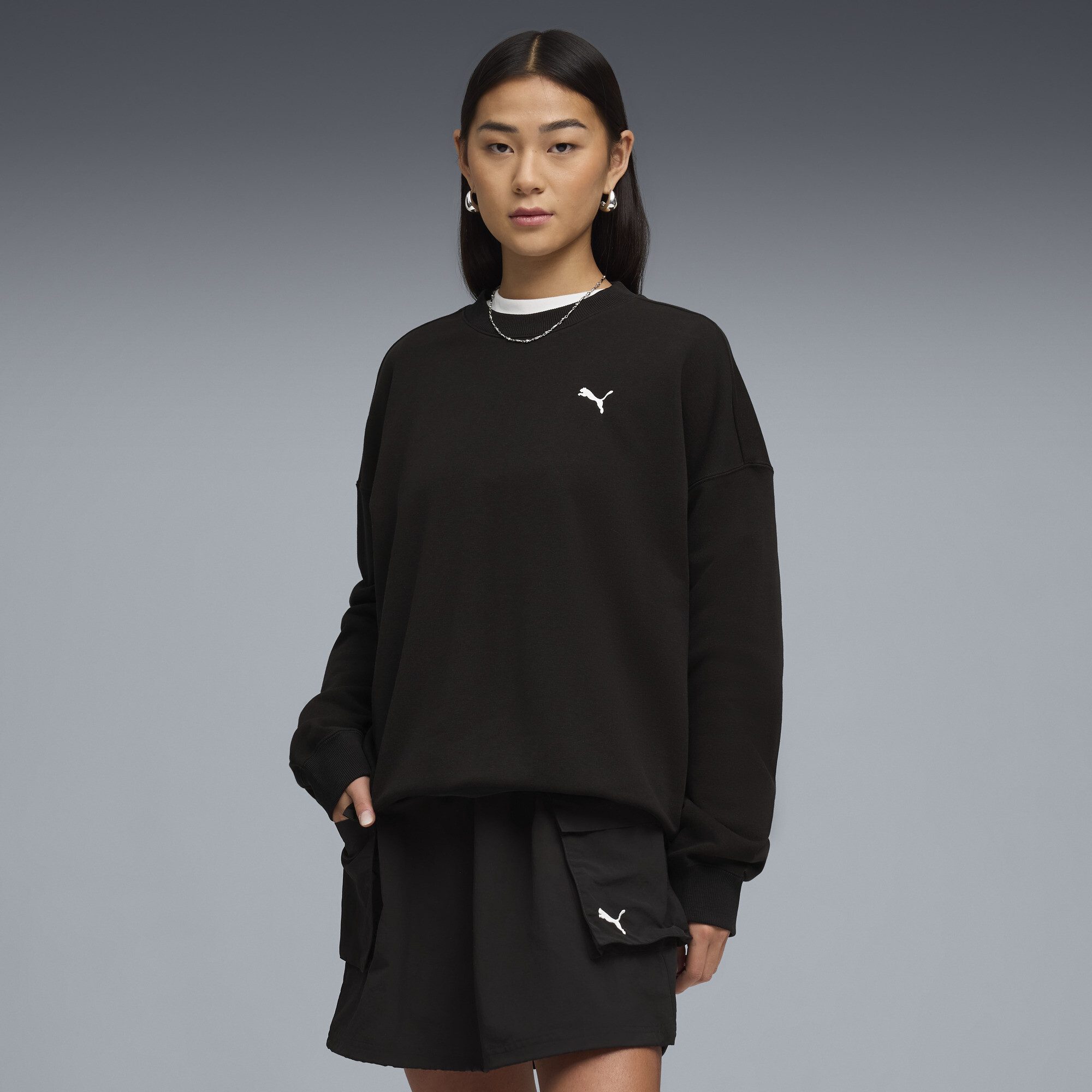 PUMA Wardrobe Essentials oversized sweatshirt voor Dames, Zwart, Maat XL